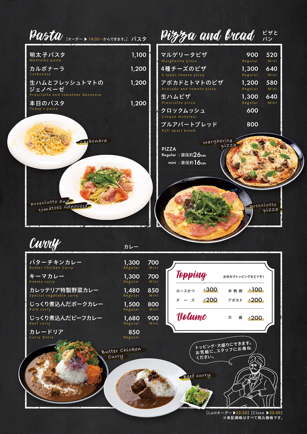 【Lunch Time】11:00~14:00 ※Lo.13:30 ランチタイムはドリンクとサラダが付いたセットです。
