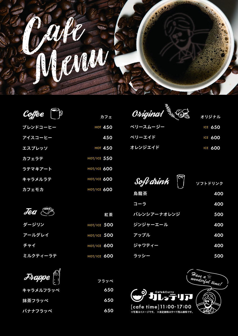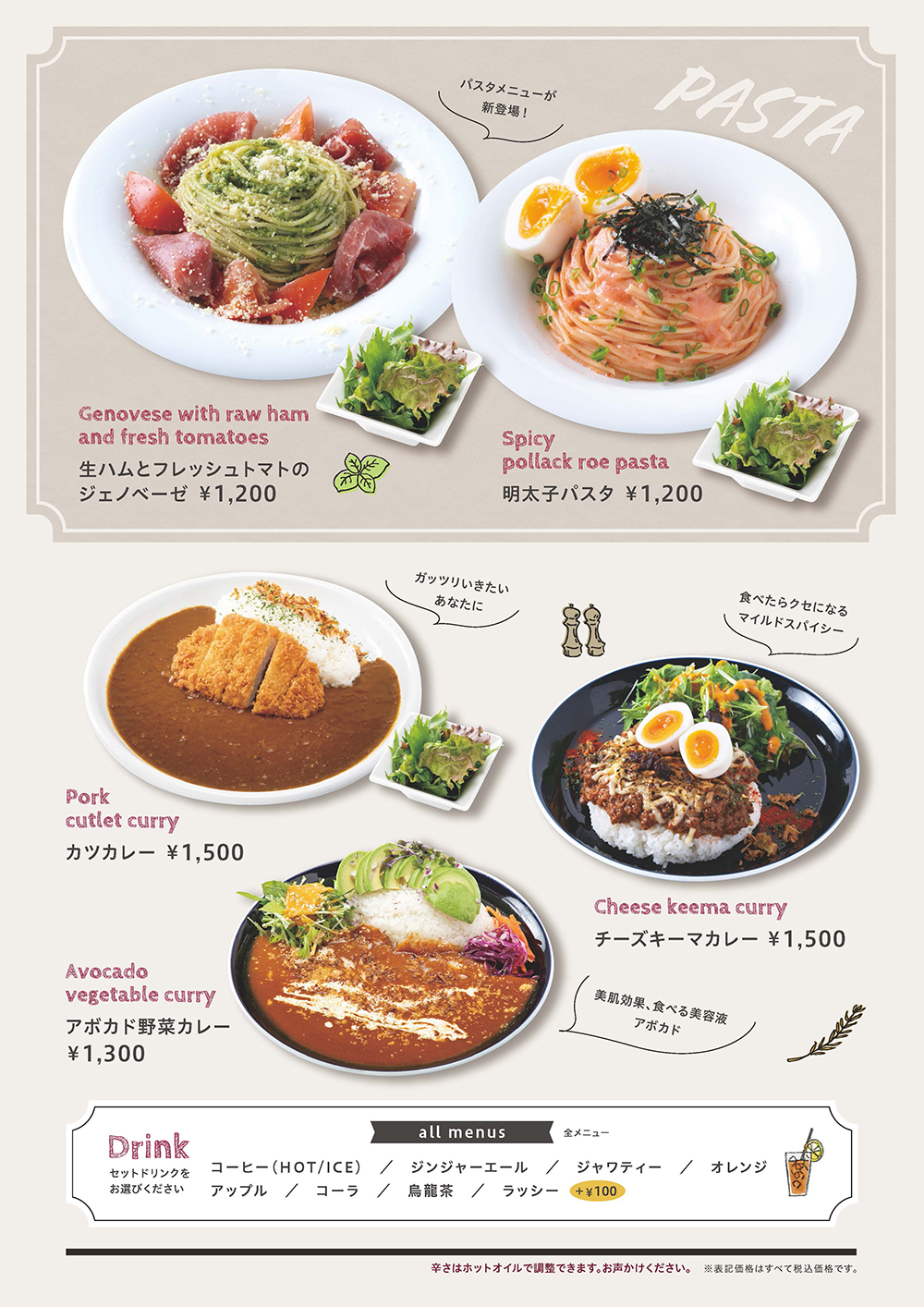 コーヒーや紅茶をはじめ、オリジナルのスムージーやフラッペなどカフェメニューもございます。ケーキとドリンクのセットもおすすめです。ランチタイムだけでなく、カフェタイムのみ、ドリンクのみのご利用も大歓迎です。