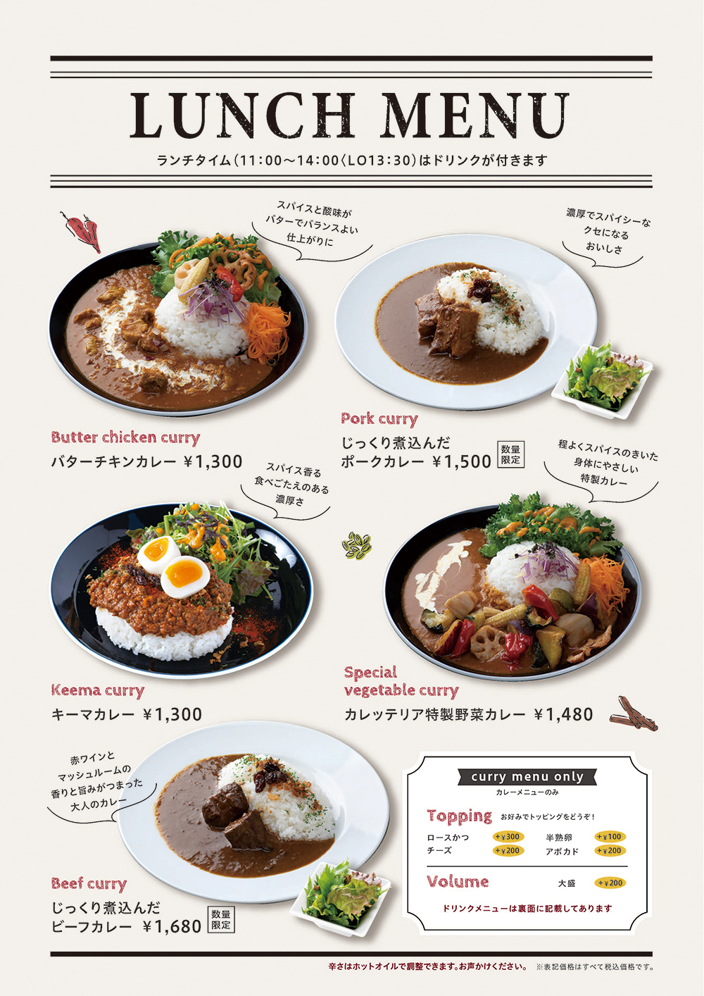 お子様や女性に人気のバターチキンカレーや、たくさんの野菜が入った特製野菜カレー、辛いカレーがお好きな方におすすめのキーマカレーなど、こだわりのカレーをご用意しております。ぜひお気に入りの味を見つけてください。
