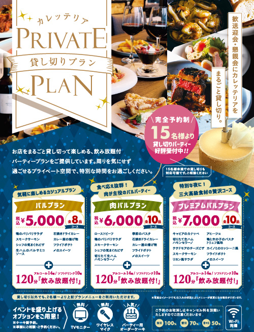 忘年会やお誕生日会、様々なパーティに最適なコース料理もございますので、まずはお問い合わせください。